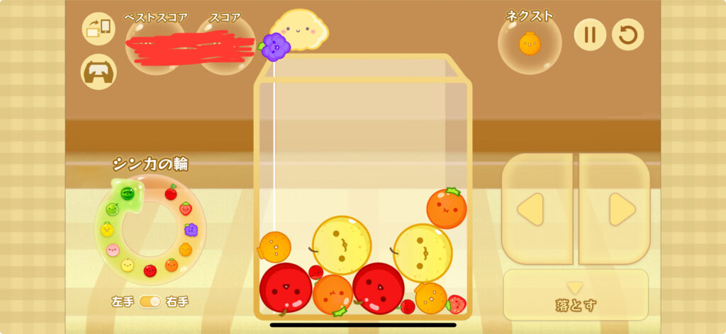 新作は過去作と違って大人数で遊べたり、違う方向からフルーツを落とせたりするので、また違った遊び方があるとおもいます。