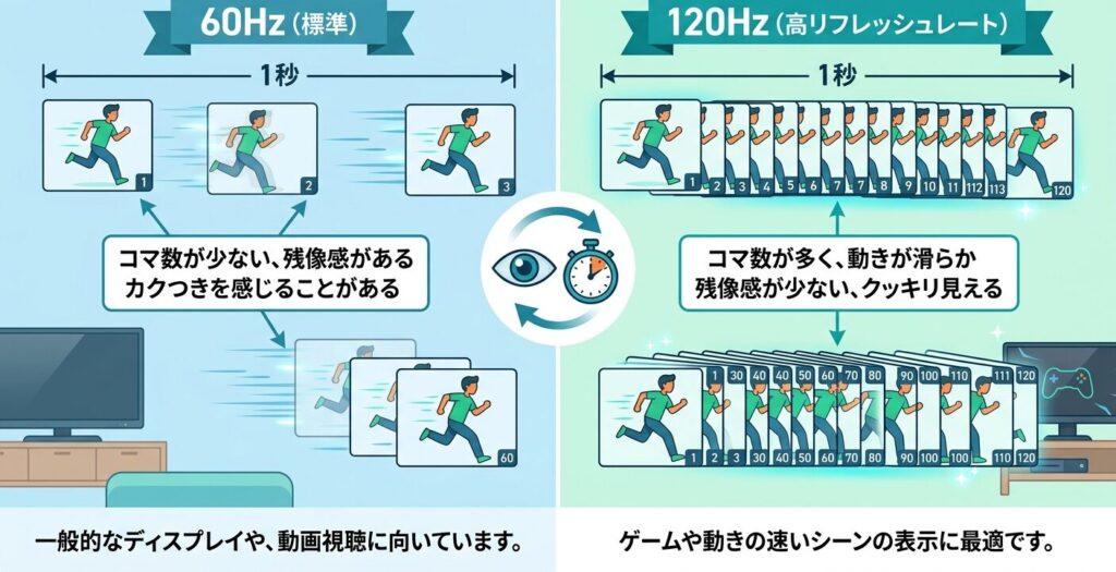 | 画面の滑らかさ | 60Hz | 120Hz |